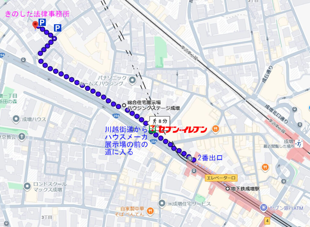 - 事務所の真ん前に一つ、事務所から約150メートルに一つコインパーキングがあります(以下地図P印)。それぞれ、キャパシティが1台なので、ふさがっている可能性があります。